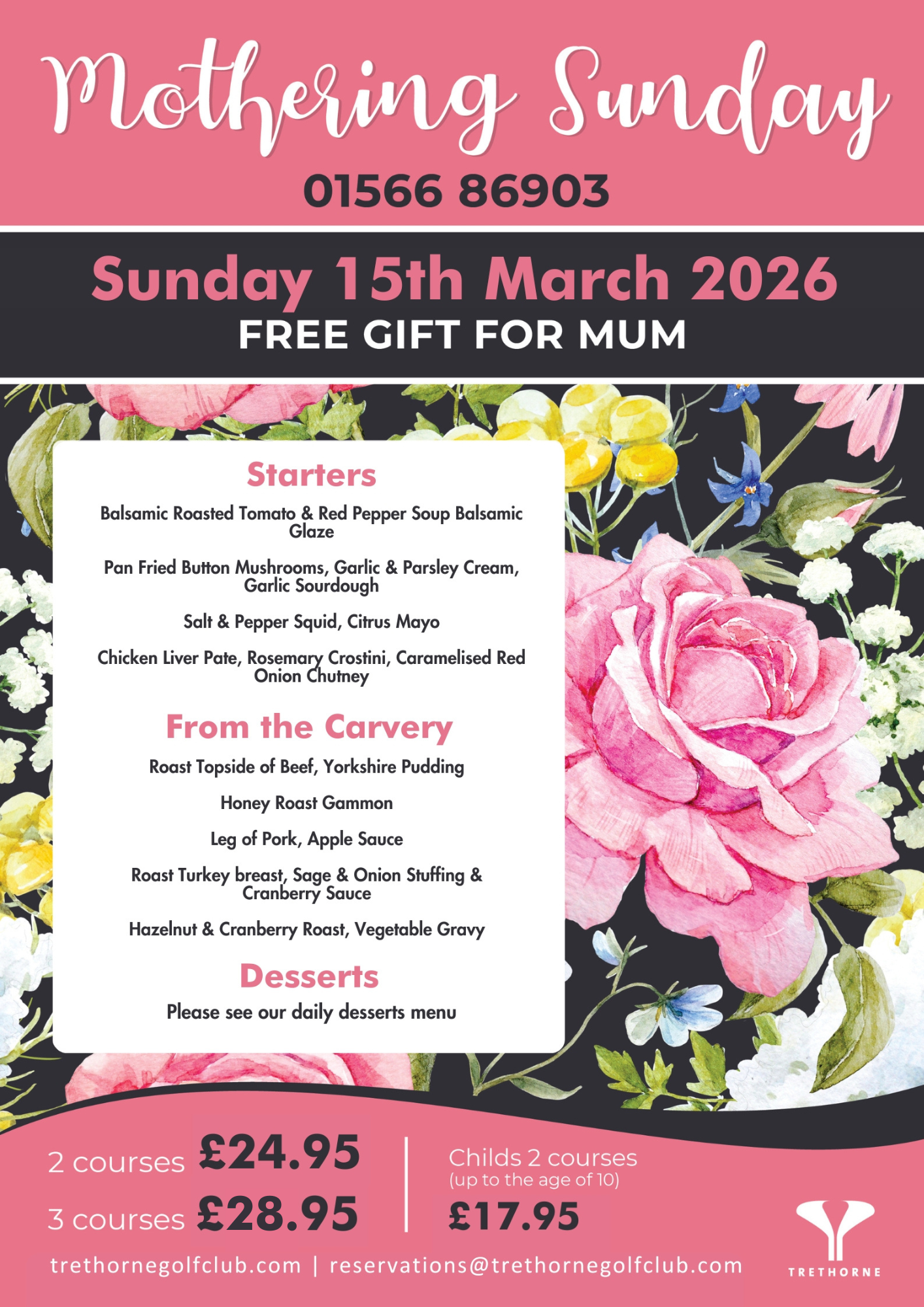 Treat your Mum to a delicious meal at Trethorne Hotel & Golf Club this Mother’s Day, 15th March 2026.