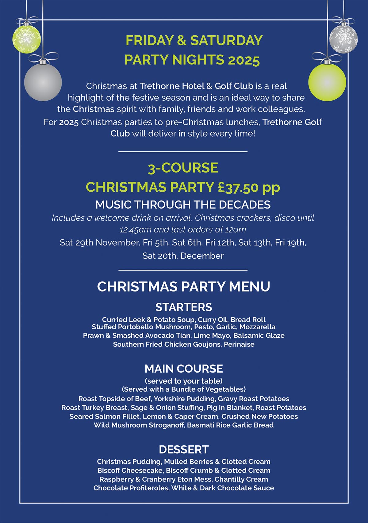 Get festive at one of Trethorne’s popular Christmas Party Nights, themed ‘Music through the Decades’, for just £37.50 per person.